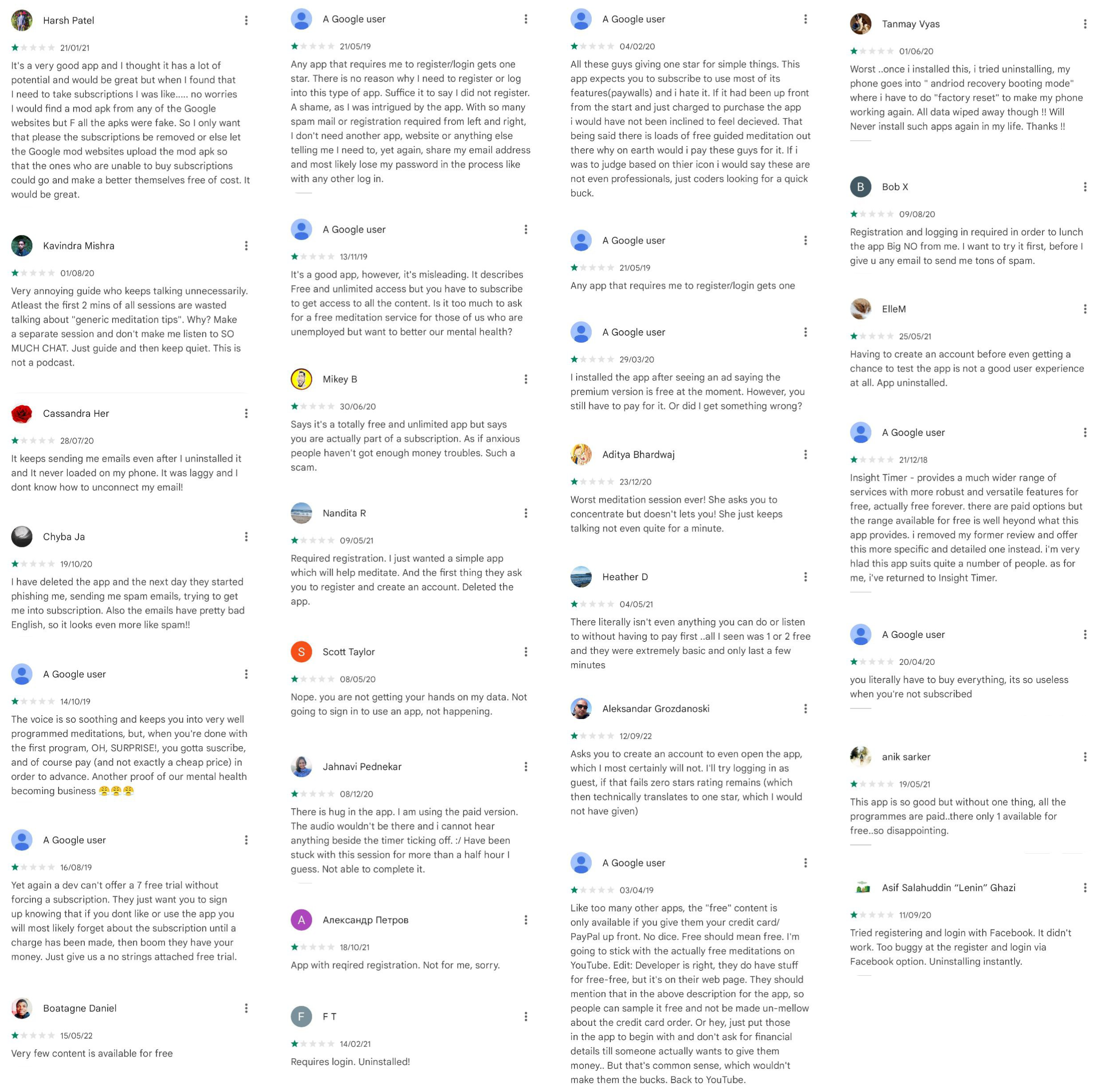 After going through hundreds of playstore reviews I found out the following problems in meditation apps
