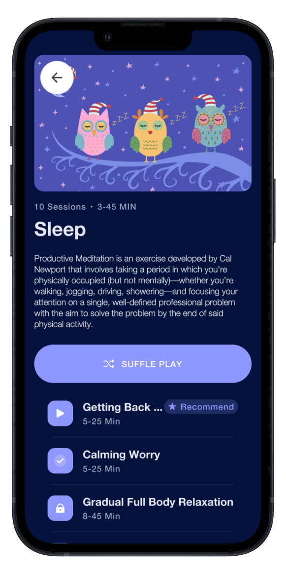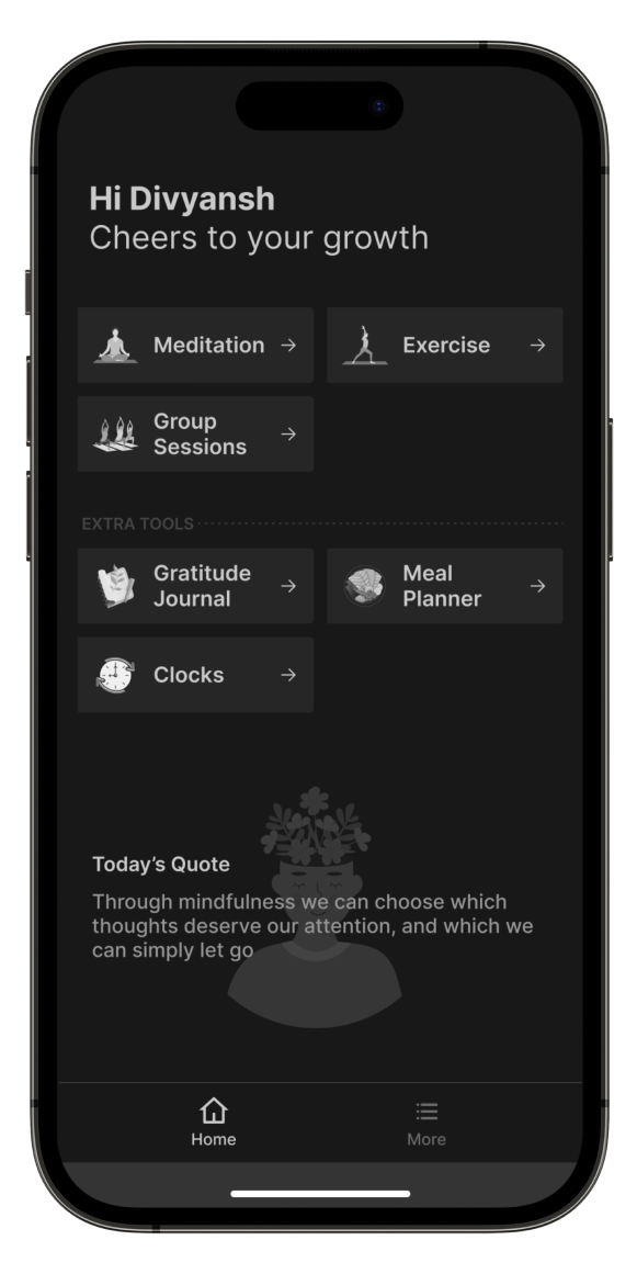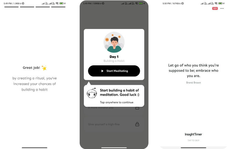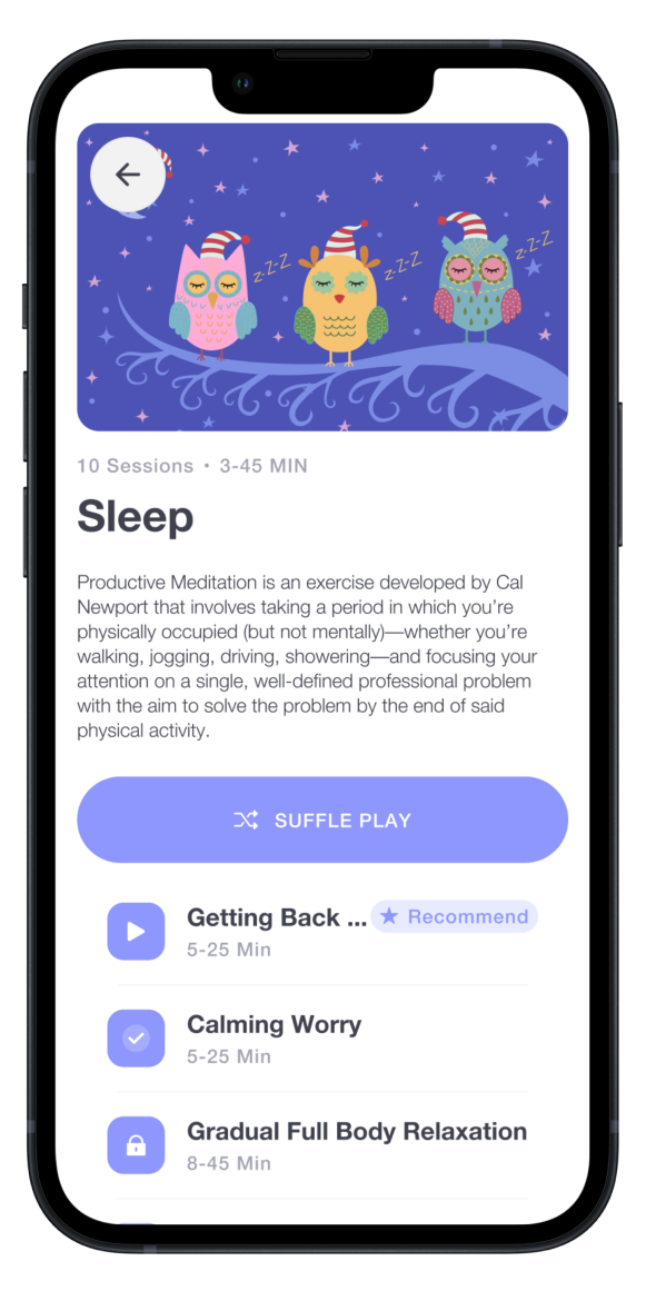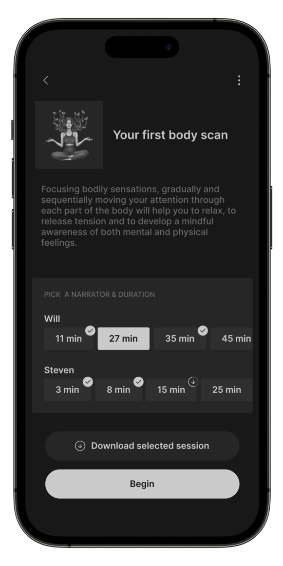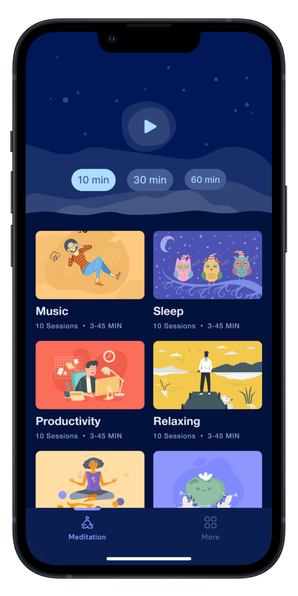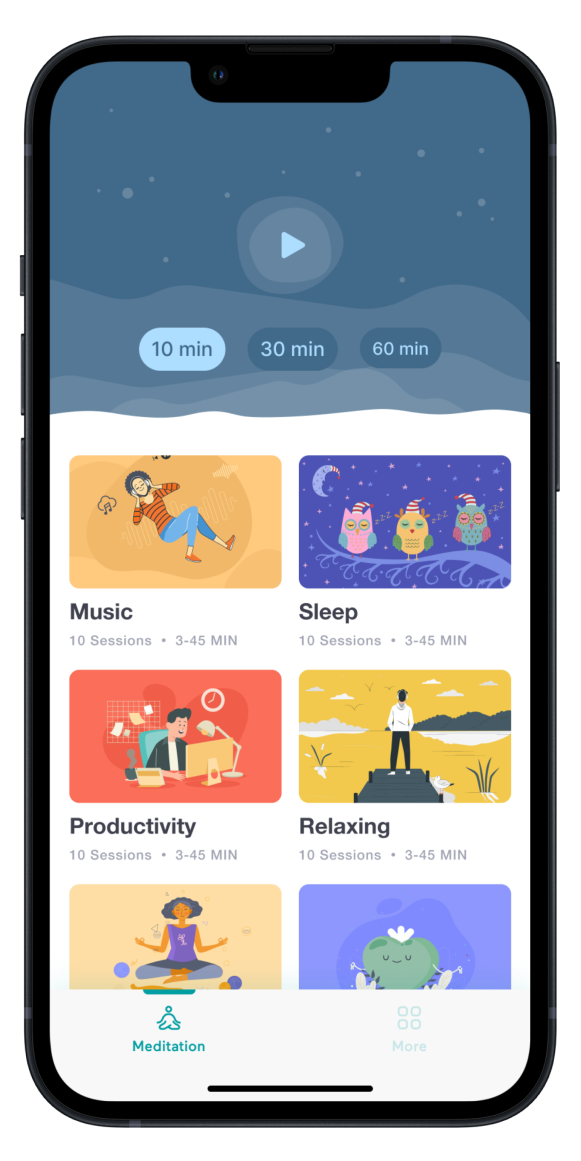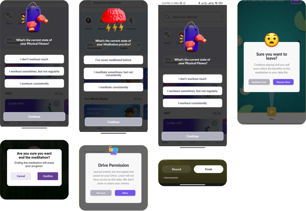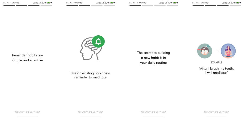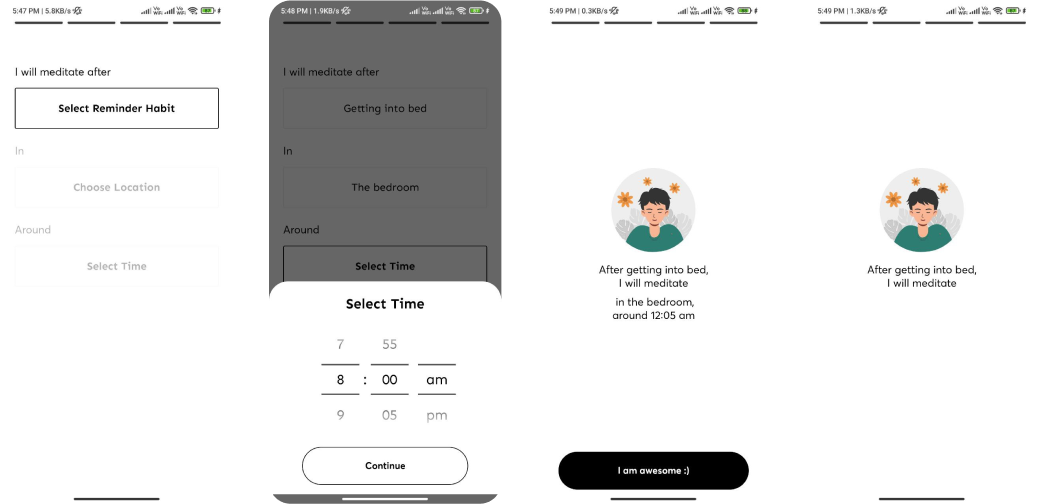 Most of the meditation apps start with a long onboarding process along with other disturbing questions arise while starting a session, ending a meditation and so on.